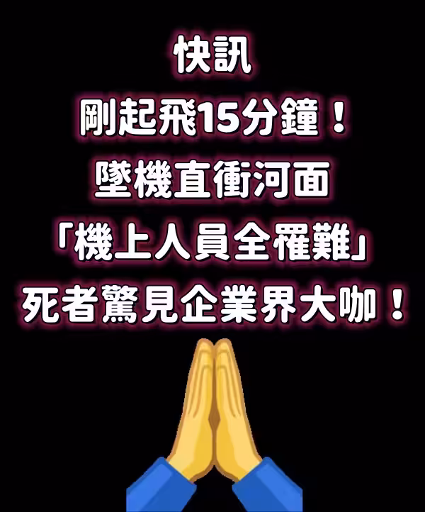 快訊/剛起飛15分鐘!墜機直衝河面「機上人員全罹難」… 死者驚見企業界大咖 !