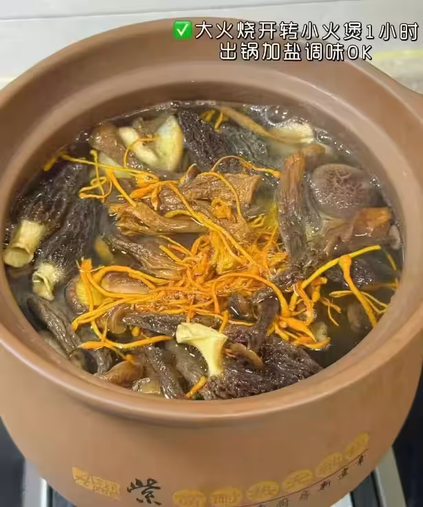 3、砂鍋里放入適量的水煮開,放入泡好的菌菇,大火燒開轉小火煲1小時,出鍋前加入枸杞、鹽調味OK