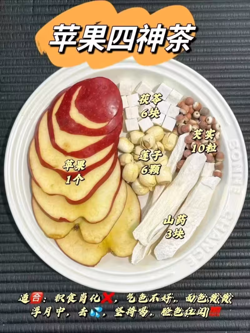 食材:蘋果1個+茯苓6塊+芡實10粒+蓮子6顆+山藥3塊
