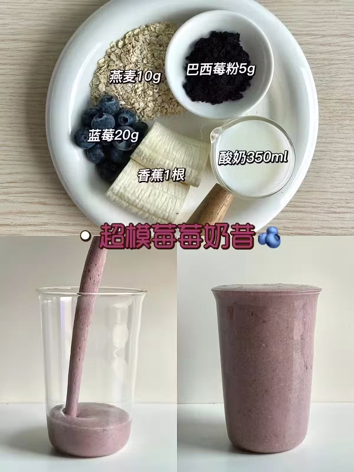 即食燕麥10g+香蕉1根+藍莓20g+巴西莓粉5g+酸奶350ml