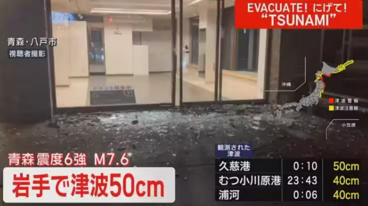 日本青森縣外海當地時間今(8)日晚間11時15分左右發生地震,規模7.6,11時33分又發生規模5.6地震,北海道、青森縣岩手縣等多地發布海嘯警報後,陸續測得海嘯襲來。