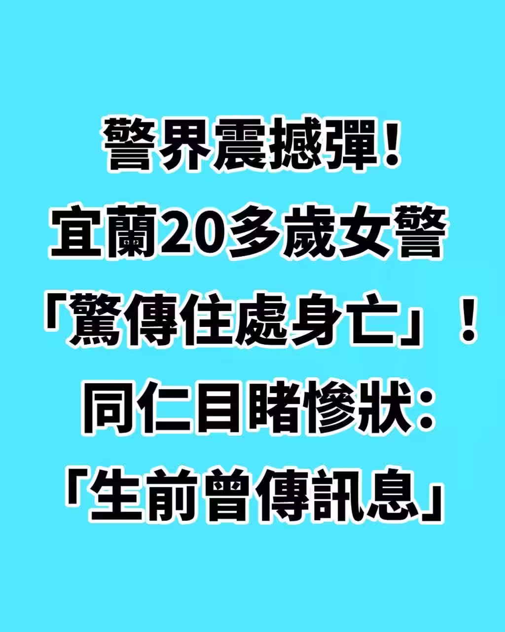 讓人想起,幾個月前宜蘭警界也發生過一個令人悲痛的案情,一名警專第38期畢業、20多歲的王姓女警,在租屋處浴室內不幸猝逝,讓所有認識她的人都難以接受這個突如其來的噩耗。