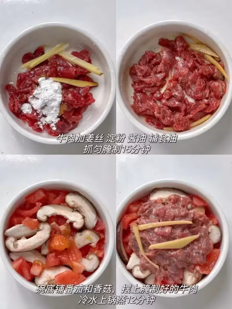 2. 番茄和香菇切塊鋪底,放上腌好的牛肉,水開上鍋,大火蒸12分鐘即可出鍋。