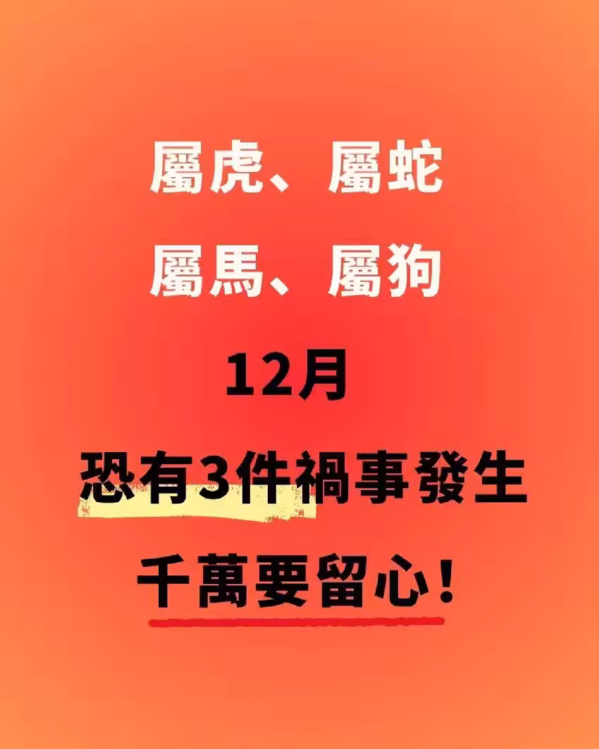 「 屬虎、屬蛇、屬馬、屬狗」12月恐有3件禍事發生,千萬要留心