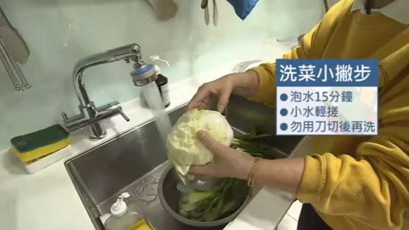 關於蔬菜農藥殘留問題,專家建議大家可以透過正確的清洗方式來降低風險:先將蔬菜浸泡 10 至 20 分鐘軟化農藥,再用流動清水沖洗 2 至 3 次,根部及皺褶處也要特別加強清潔。另外,不要先切再洗蔬菜,避免農藥滲入食材內部。