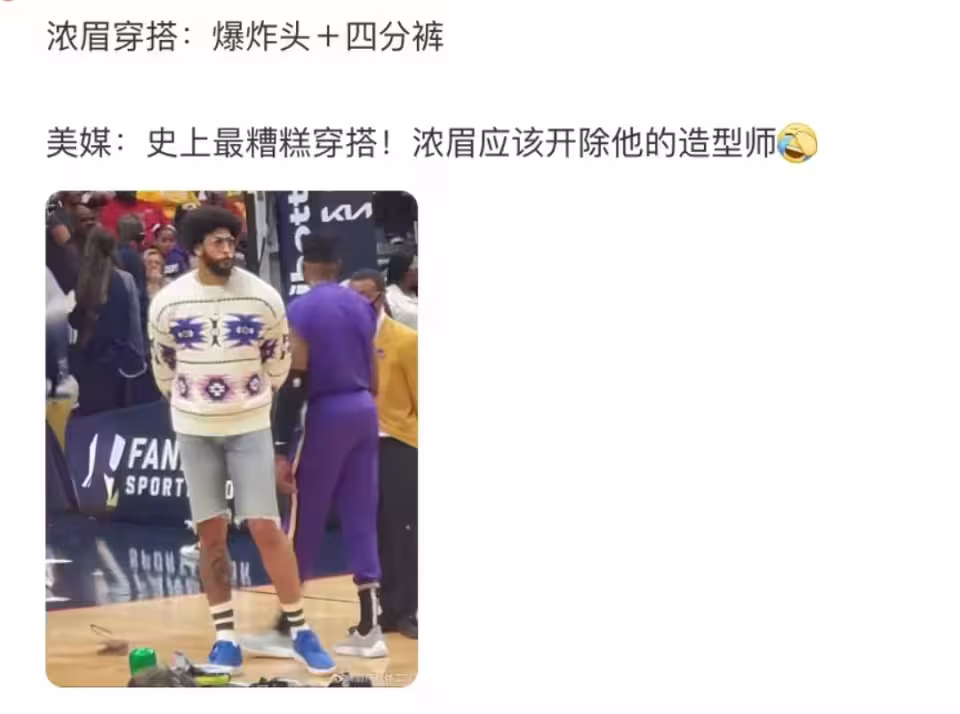近日,獨行俠主力中鋒濃眉戴維斯的新造型搭配引起了球迷廣泛的熱議。媒體更是將它稱為NBA歷史上最糟糕的穿搭組合,更喊話戴維斯開除他的造型師。