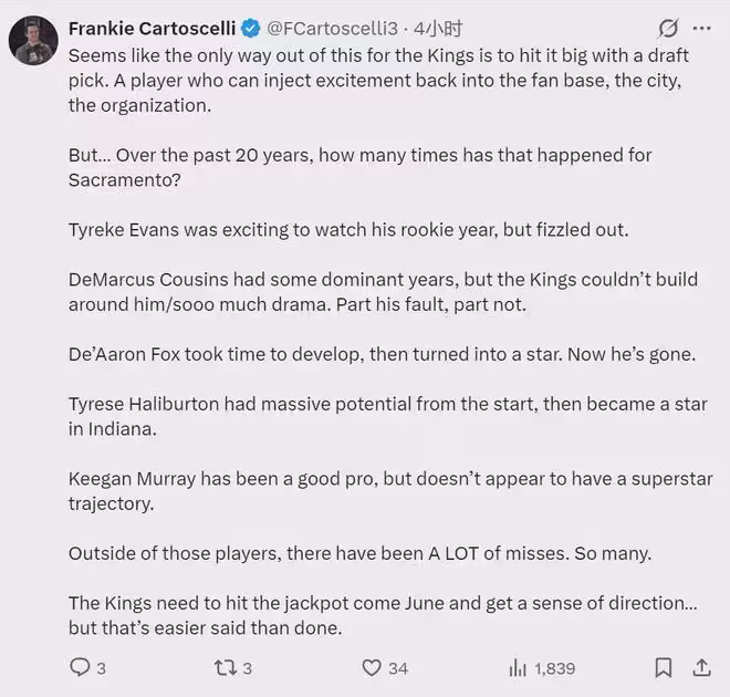國王105-136狂輸掘金31分,賽後國王記者Frankie Cartoscelli寫道:「國王唯一的出路就是通過選秀找到一位巨星,能夠重新點燃球迷熱情和球隊士氣。說起來容易做起來難,回顧過去20年選秀,國王又有多少次實現這種願望呢?」