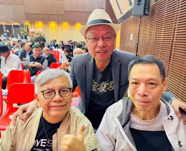 照片中李健仁的身形比以往消瘦很多,頭髮也多了些許白髮,但當日他的精神狀態還算不錯,面帶微笑與老友田啟文及李力持合影。