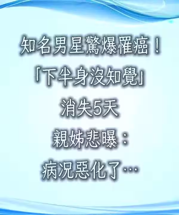 知名男星驚爆罹癌!「下半身沒知覺」消失5天 親姊悲曝:病況惡化了…