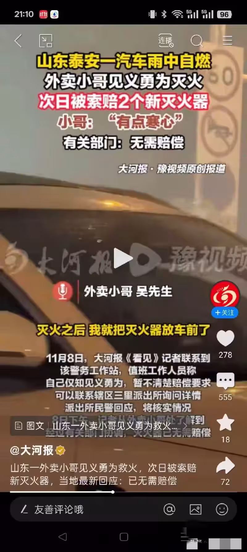 車輛自燃外送小哥「挺身救火」!次日被索賠新滅火器...讓他寒心,警方回應!