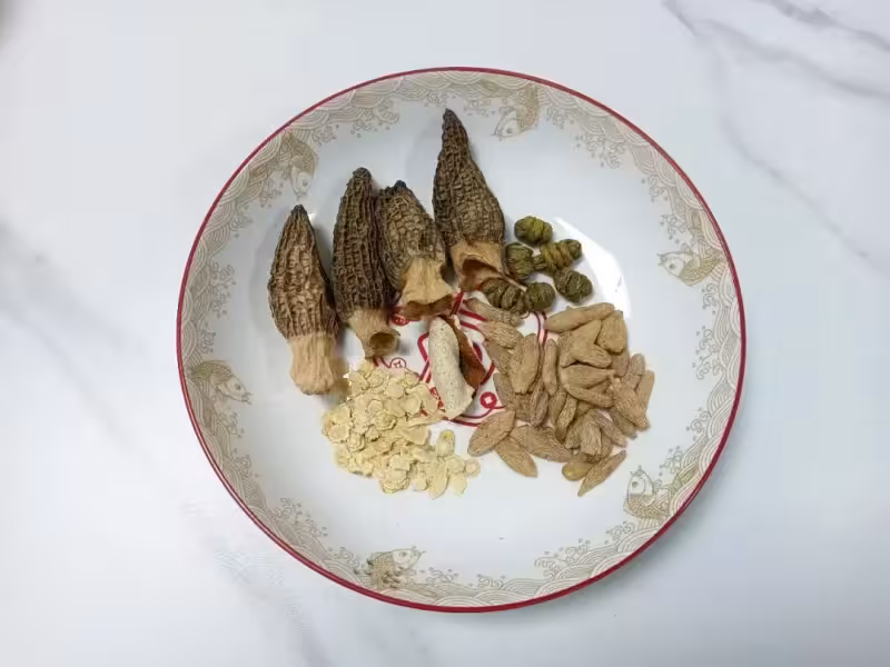 羊肚菌3-4個、西洋參10克、石斛5-6粒、麥冬15克、陳皮適量、豬骨或雞肉適量