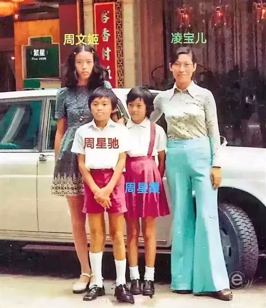 照片中,周星馳與他的媽媽和姐姐在簡樸的背景下微笑合影。周星馳的母親凌寶兒,1957年丈夫被關入監獄後,帶著兩個女兒和一個兒子從廣東來到香港謀生。為了養家餬口,凌寶兒嫁給了一位祖籍浙江寧波的小伙兒,一家五口擠在一間狹窄的木板房裡。