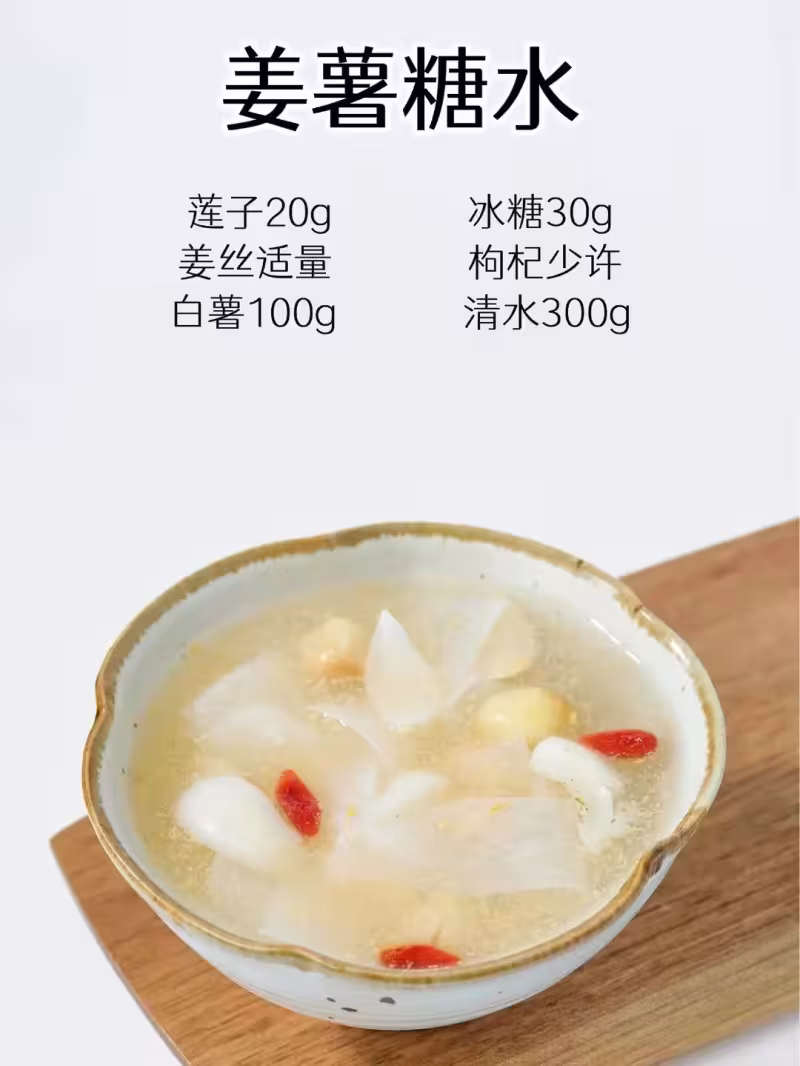 白薯去皮切片,與蓮子、薑絲同煮至綿軟,