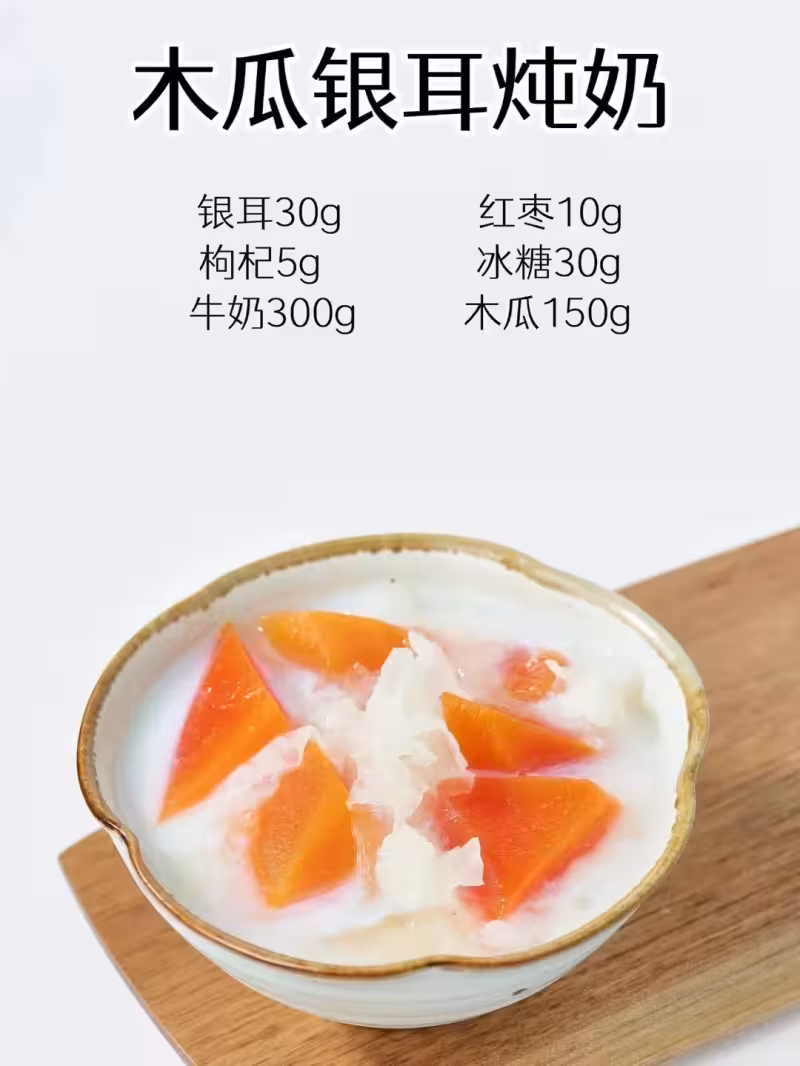 銀耳泡發後燉至出膠,加入木瓜、紅棗與冰糖,關火前倒入牛奶攪勻。