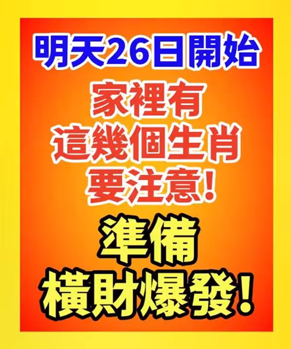 明天26日開始,家裡有這幾個生肖要注意,準備橫財爆發!26日是一個財氣沖天的日子,家裡如果有這幾大生肖,將迎來命宮財運大旺的幸運時刻,橫財不請自來,偏財、正財齊齊大爆發!不僅有機會中得彩票大獎,還可能因為貴人指點而獲得意外之財。 這一天他們的運勢如虹,簡直旺到令人羨慕,準備好迎接財富滾滾而來吧!