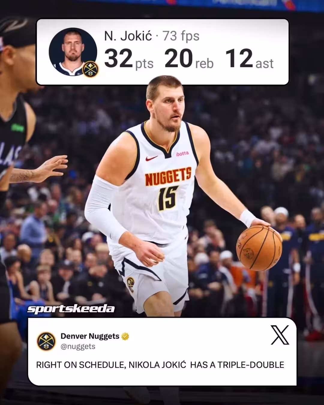 比賽輸了,但約基奇這場比賽又一次交出炸裂表現:全場出戰38分鐘,投籃22中11,罰球13中12,拿下34分21籃板12助攻的豪華三雙。