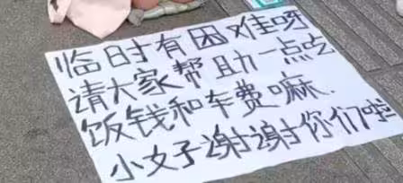 仔細一看,還可以發現女子前方地板上放著一塊紙板,上頭寫著「臨時有困難呀!請大家幫助一點吃飯錢和車費嘛~