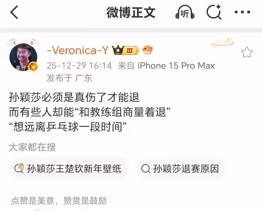 說實話,王楚欽最近累成什麼樣,明眼人都看得出來。混合團體世界盃他出場次數全隊第一,總決賽時狀態就很差,自己都說「不在正常狀態」。運動員也是人,連續作戰誰能受得了?孫穎莎的傷是看得見的痛,王楚欽的累是看不見的傷。一個手腫了要繼續打,一個身心俱疲想緩口氣,本質上都是被密集賽程折磨的結果。