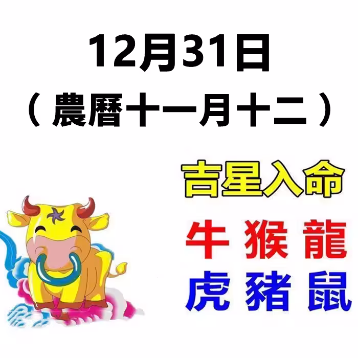 12月31日(農曆十一月十二)生肖運勢_牛、猴、龍大吉