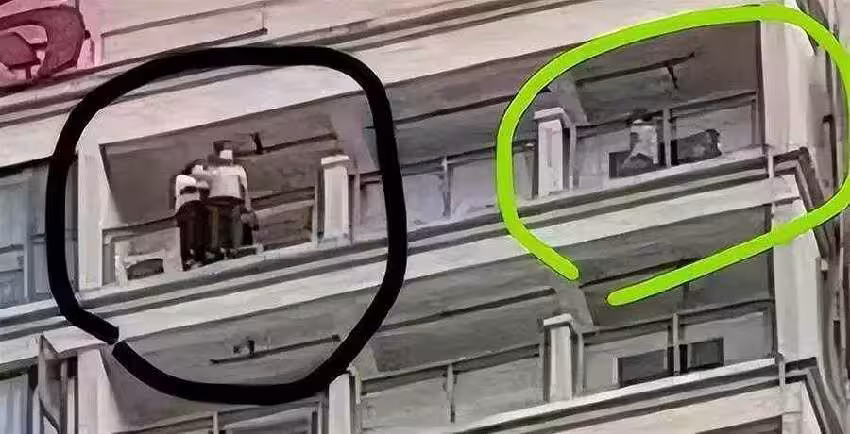 不知是誰最先發現異常,只見位於31樓的陽台上站立著兩個年輕人,他們的身形已經翻越欄杆,一副隨時掉落的樣子。