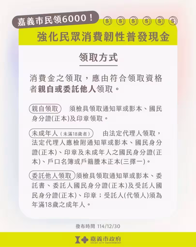黃敏惠進一步指出,如市民因故無法於上述時段領取現金,可於115年3月2日(一)至3月15日(日)申請轉帳,提供線上及紙本兩種方式,相關申請網站嗣後再行公告;款項115年4月30日(四)前撥款入帳;未於期限內領取或申請轉帳者,視同放棄,不再發給。