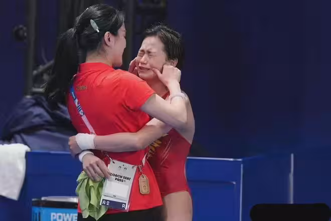 手握本屆巴黎奧運會兩塊金牌的冠軍全紅嬋,最讓人印象深刻的一幕,不是她生硬地拒絕記者教她學「拿捏」兩個字的英文單詞,而是她在單項比賽奪冠後,第一時間跳進了教練陳若琳的懷裡,久久痛哭,不能釋懷,情緒無法平息。