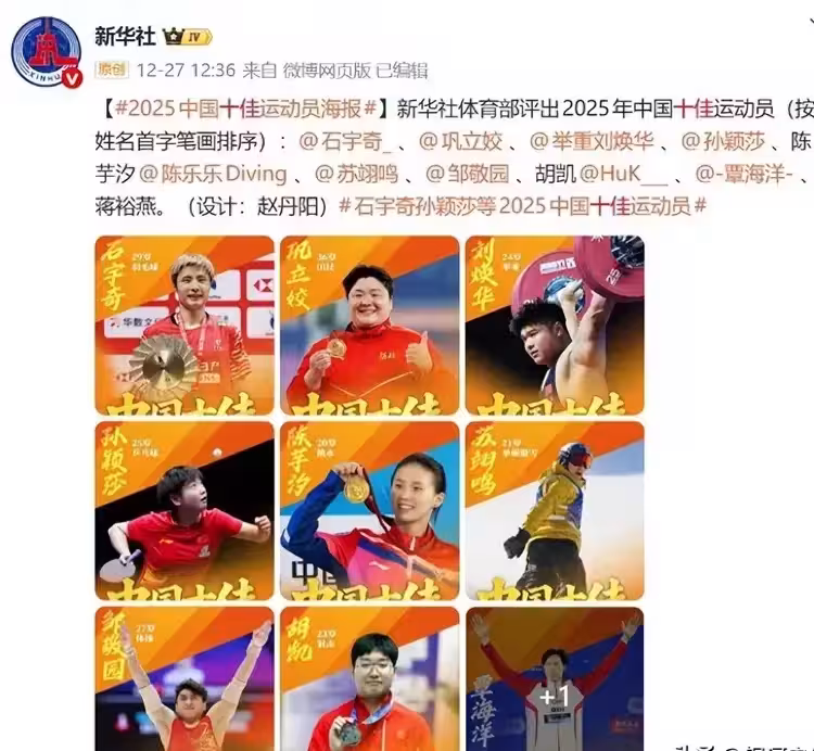 12月27日,新華社體育部公布了2025年中國十佳運動員名單,孫穎莎、石宇奇、陳芋汐、鞏立姣等十位運動員獲此殊榮。