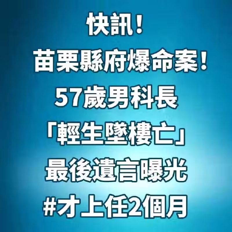 快訊/苗栗縣府爆命案!57歲男科長「輕生墜樓亡」... 最後遺言曝光 #才上任2個月!