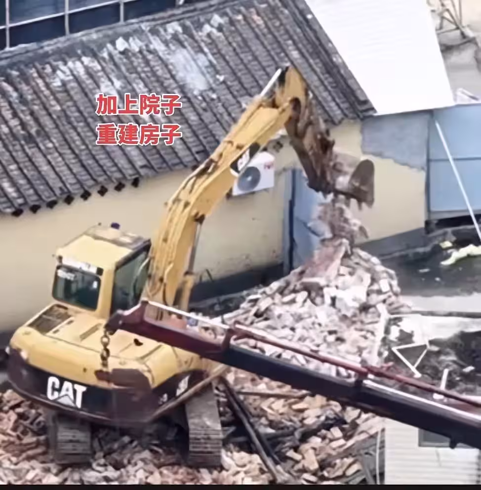 住宅的位置大概80平左右,挖掘機已經進場了,把原來的磚瓦房推倒,接著施工原料就可以進場了。