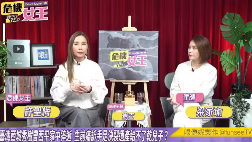 資深媒體人許聖梅日前邀請律師梁家瑜上節目,針對曹西平的遺產問題來討論,律師點出殘酷現實,表示曹西平手足如果放棄繼承,最後他的遺產恐會歸國庫。