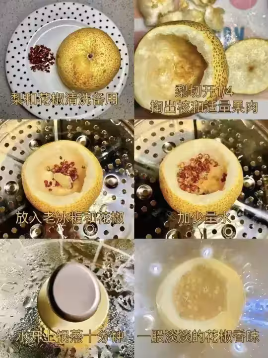 準備材料:大雪梨1個、花椒15-20粒、冰糖2-3小塊(可選)。