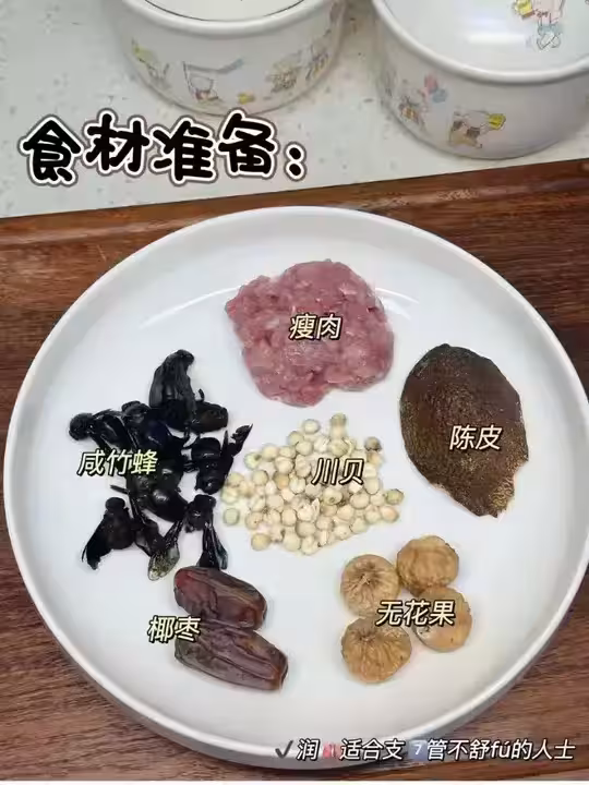 準備材料:川貝母5克(中藥店有售,可請店員搗碎)、陳皮1片、豬瘦肉100克、生薑1片。