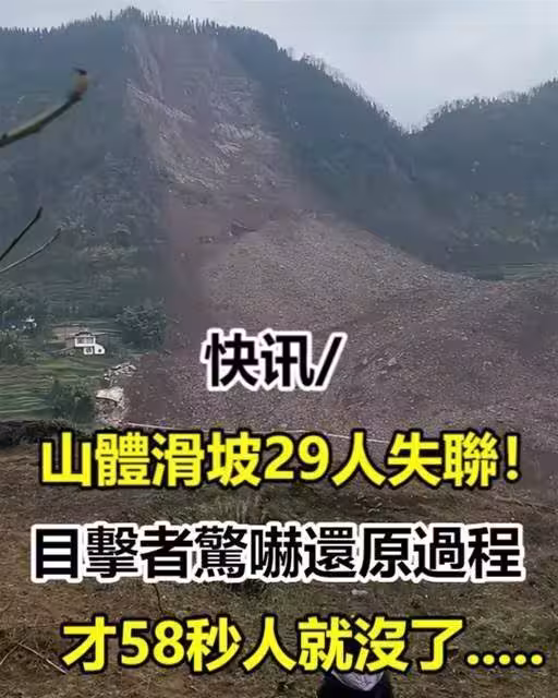 至少29人失聯! 目擊者驚嚇還原過程:「才58秒人就沒了.....」四川省宜賓市筠連縣沐愛鎮金坪村發生大規模山崩,導致多棟民宅被掩埋,造成29人失聯。