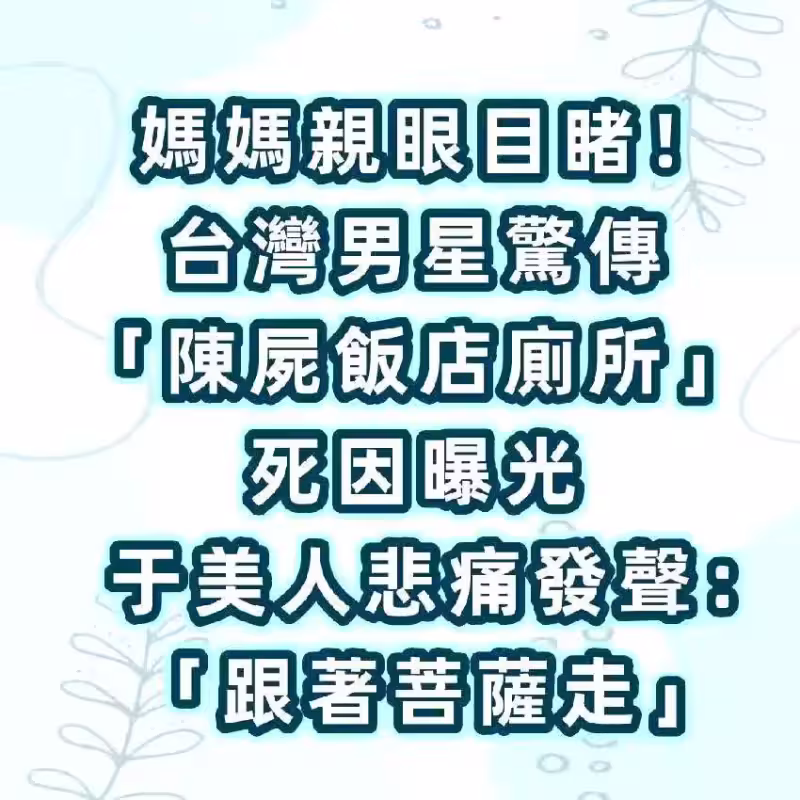 媽媽親眼目睹!台灣男星驚傳「陳屍飯店廁所」死因曝光 于美人悲痛發聲:「跟著菩薩走...」