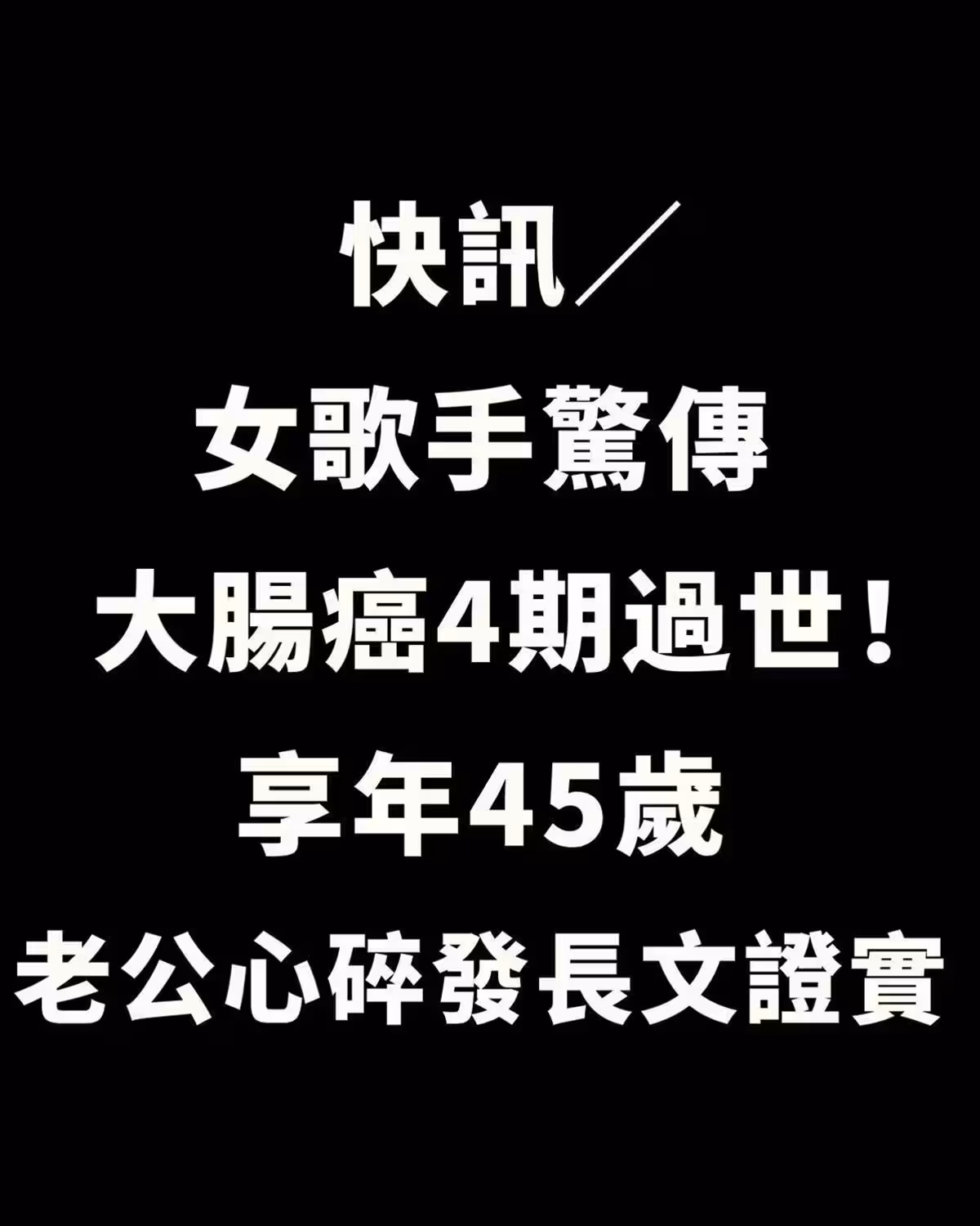 快訊 / 女歌手驚傳大腸癌4期過世 享年45歲,老公心碎髮長文求證