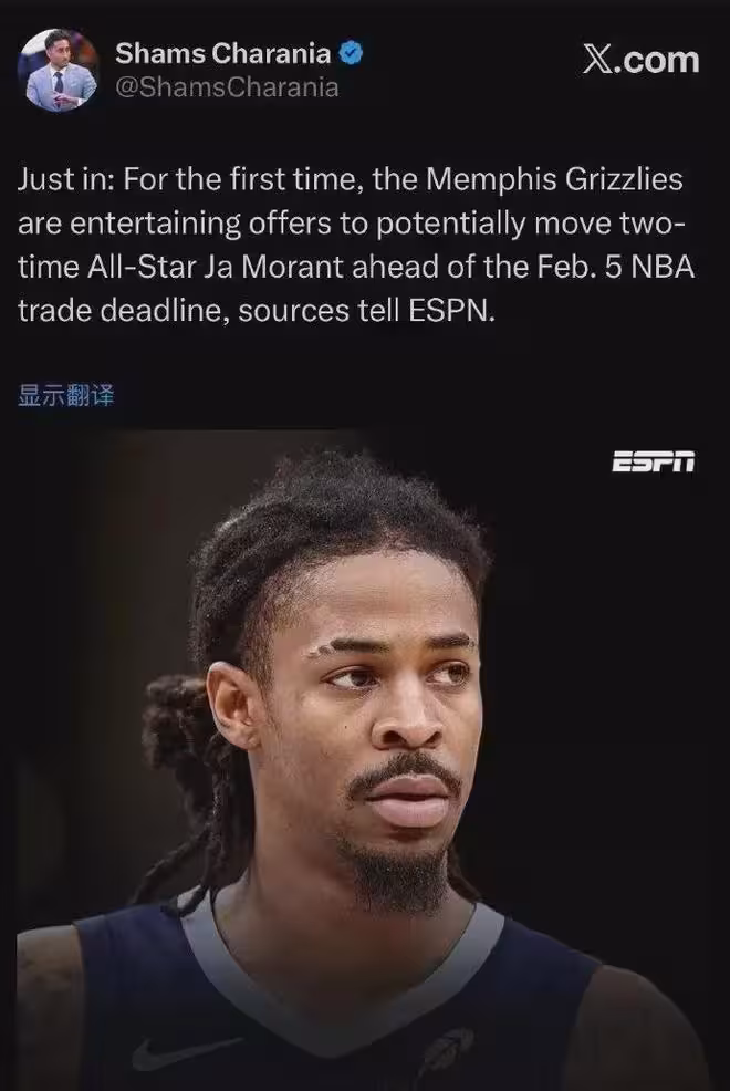 爆料王Shams:灰熊考慮送走莫蘭特,首次將在本賽季交易截止日(2月6日)前聽取他的報價。