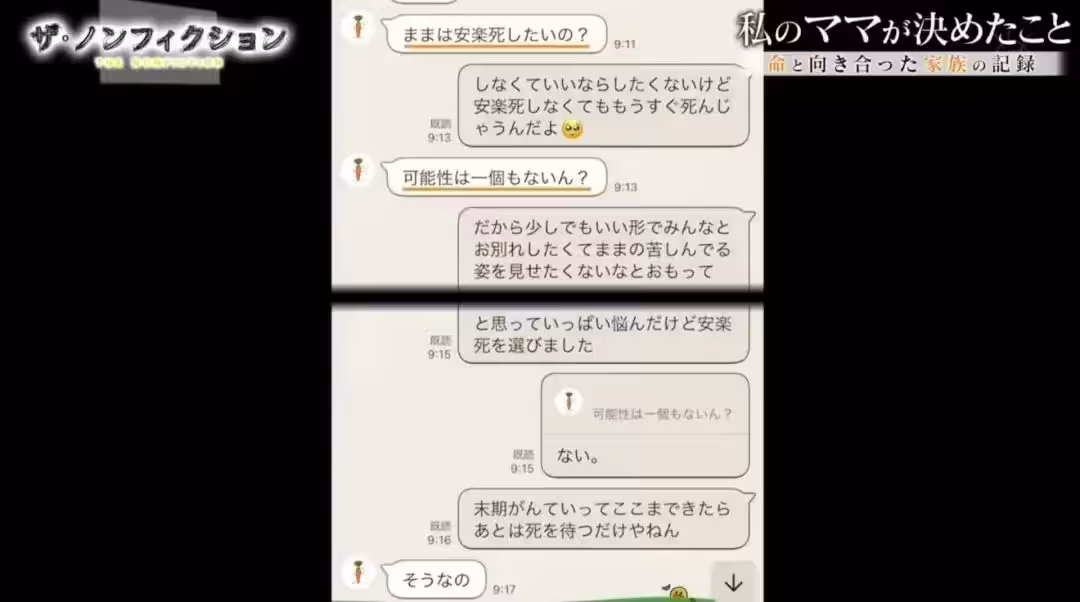 在對話的途中,真由美突然對小女兒道歉「對不起,我生病了」。小女兒回復道「這並不是媽媽的錯」。雖然小女兒當時還沒有理解媽媽的決定,但母女兩人的對話真情流露,感人至深。