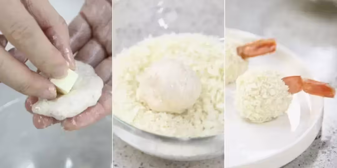 手上塗抹一層植物油防粘,取一小團蝦肉糊在手上壓扁,放上切成小塊的馬蘇里拉芝士,包起來(蝦肉泥比較黏,所以手上要多抹一些油防粘,包的時候動作迅速一些,不要太用力以免粘手)。