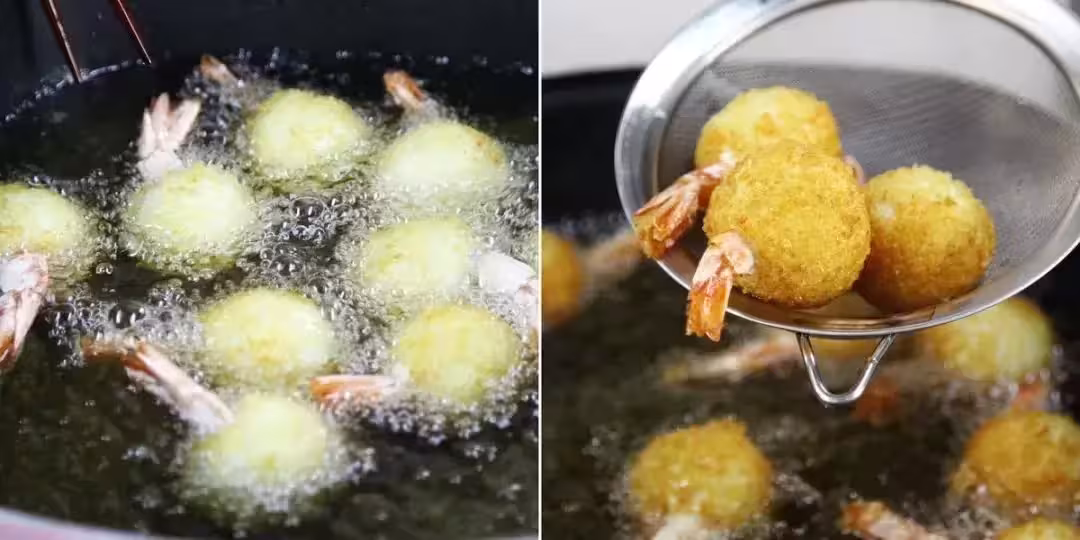 油熱後轉中火,將蝦球輕輕放入油鍋里,用中火炸制,大約需要2-3分鐘就可以讓蝦球變色了。