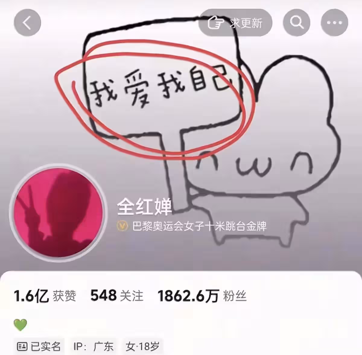 當全紅嬋的某音主頁從鮮亮的綠色切換為沉靜的灰色,一句「我愛我自己」的簽名靜靜陳列,無數網友瞬間讀懂了這個18歲姑娘的委屈與無奈。那個曾以「水花消失術」驚艷世界的天才少女,此刻正用最沉默的方式,訴說著成長路上的重重困境。