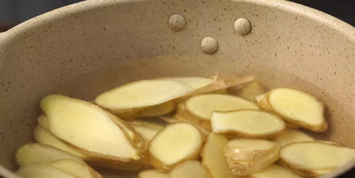 當燜煮的時間到了,我們用漏勺將燜煮好的生薑片撈出,並迅速放入冰水中浸泡。