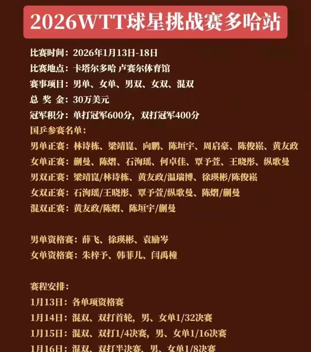 這場2026年WTT球星挑戰賽多哈站,是在1月13日到18日卡達盧賽爾體育館開的,總獎金30萬美元。單打冠軍能拿大號600分,成了國乒新生代專屬試煉場。因為本次王楚欽、孫穎莎等主力都休息,新一批年輕選手上位,如果想沖世界大賽、繼續追分,贏下這個賽事,冠軍積分就很重要。