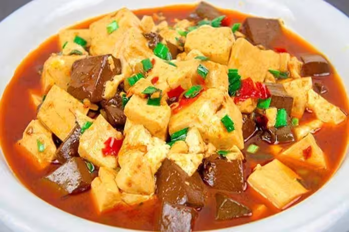 3.鍋內燒油,放入蒜末和蔥花爆香,加入豆瓣醬10克炒出紅油,放入適量的清水沒過豆腐和豬血,加入老抽提色、生抽鮮味、十三香2克、胡椒粉2克、食鹽2克、雞粉2克,少許白糖提鮮,開大火收汁。4.湯汁收濃以後撒上韭菜花、淋上花椒油,美味即成。4/30
