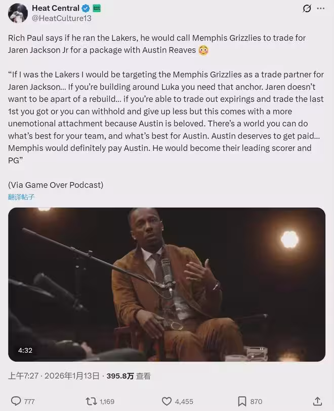 里奇-保羅第一次談及湖人陣容時,沒有具體點名某個球員,當時湖人管理層並未放在心上。如今他公開提到用里夫斯去換3J,顯然不利於湖人更衣室穩定。里奇-保羅不僅是詹姆斯的經紀人,他倆也是20多年的摯友和商業搭檔。