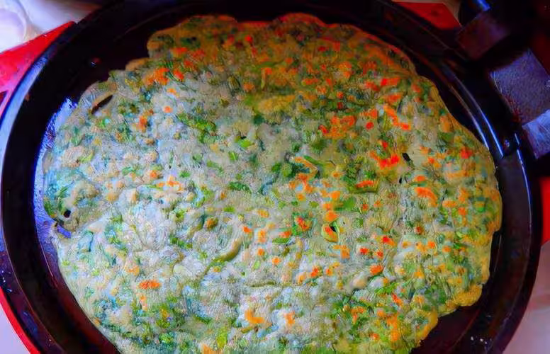 在碗裡面加入一些麵粉,水和雞蛋,攪拌均勻,把它和成麵糊。也可以加入別的一些蔥花,胡椒粉等調味,然後拿一個平底鍋加熱以後打入少許食用油,舀一勺麵糊倒在平底鍋裡面,慢慢的煎煎至兩面金黃,煎熟以後就可以吃了,就是正宗的辣椒葉雞蛋煎餅。