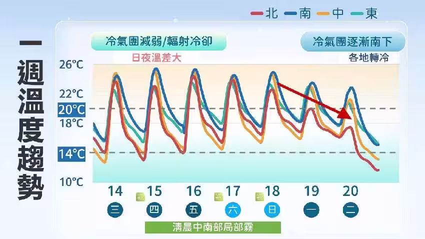 今(15日)風力微弱,受輻射冷卻影響,早晚仍偏冷,西半部及宜蘭低溫普遍在12至15度,花東地區低溫約16至17度,白天北部和東半部23至25度,中南部可達27至28度,各地大多為多雲到晴。