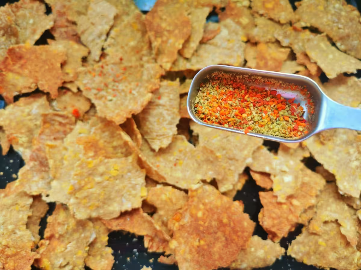 烤好的鷹嘴豆全麥薄脆餅掰成小塊,加入辣椒粉、孜然粉、黑胡椒粉拌勻,放入保鮮袋保存。