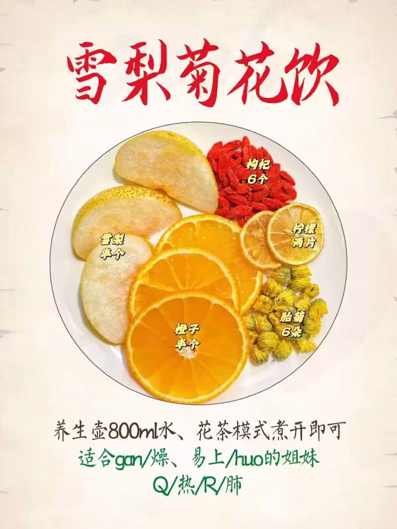 雪梨4片、6顆枸杞、兩片雪梨、4個橙子片、6朵胎菊,雪梨和橙子帶皮切薄片,枸杞菊花直接扔進去,開水燜15分鐘就能喝,這個適合下午嗓子乾的時候喝,菊花清肺熱,雪梨潤燥,枸杞補一點,喝完嗓子裡那種乾澀感就沒了,比白開水好喝太多。