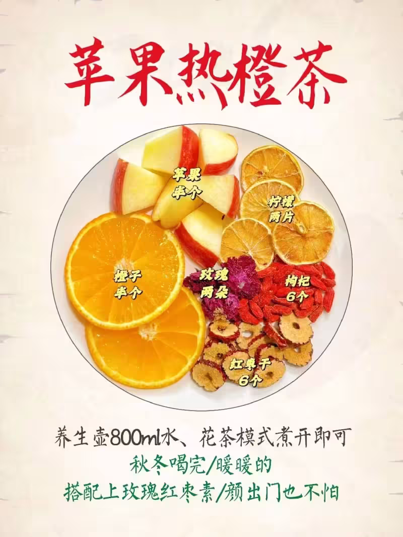 半個蘋果切片、兩片橙子、3朵玫瑰花、6顆枸杞、3片檸檬、6顆紅棗子,蘋果和橙子切厚一點,檸檬薄片就行,水開後煮15分鐘,玫瑰花最後放,這個酸甜比例我覺得剛剛好,不會太酸也不會太甜,秋冬喝完暖暖的,臉色也不會那麼暗沉。