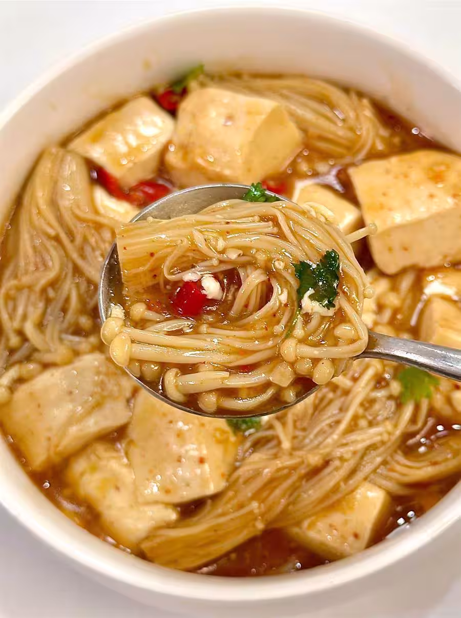 最後一步,關火後撒上適量香菜增香,豆腐金針菇煲便完成了。嘗上一口,豆腐的嫩滑與金針菇的脆爽在舌尖交織,微辣的醬汁更是讓你忍不住一口接一口。